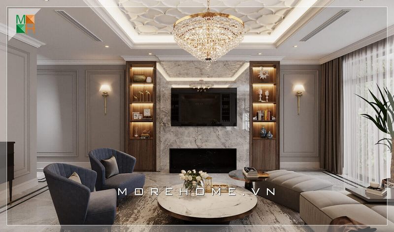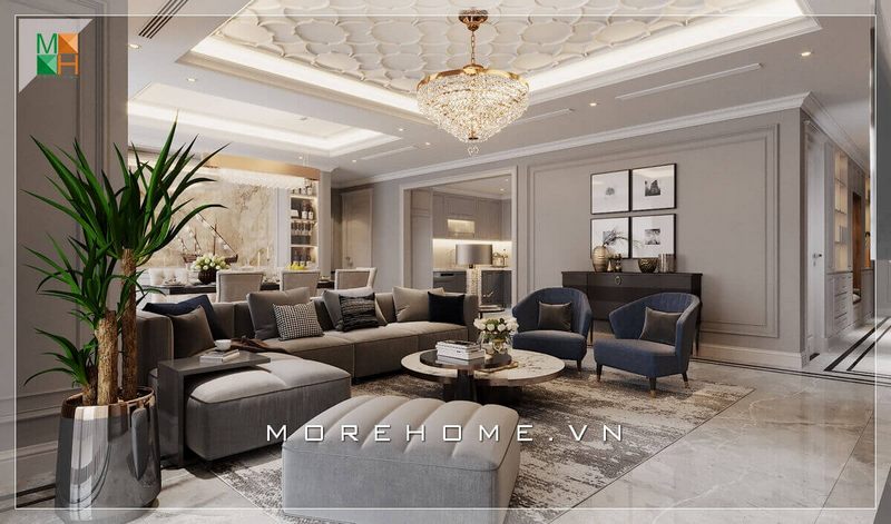 Morehome gợi ý cho bạn mẫu thiết kế nội thất phòng khách chung cư, nhà phố tiện nghi và sang trọng mang phong cách tân cổ điển.