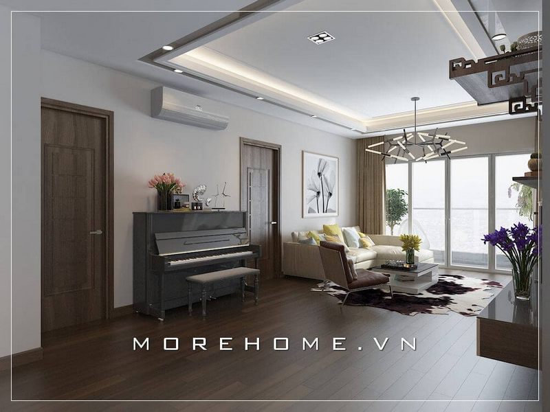 Phối cảnh phòng khách chung cư có đàn piano trang trí theo phong cách hiện đại, độc đáo.