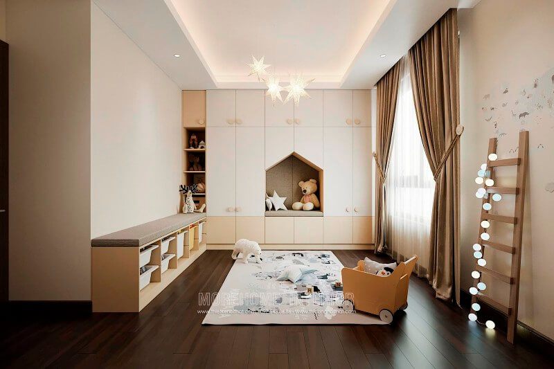 Với trang trí hệ thống tủ, kệ bằng gỗ công nghiệp hiện đại đem lại giá trị thẩm mỹ và vẫn đáp ứng được mục đích sử dụng cửa gia chủ, là nơi trưng bày những đồ vật yêu thích hay những cuốn sách.