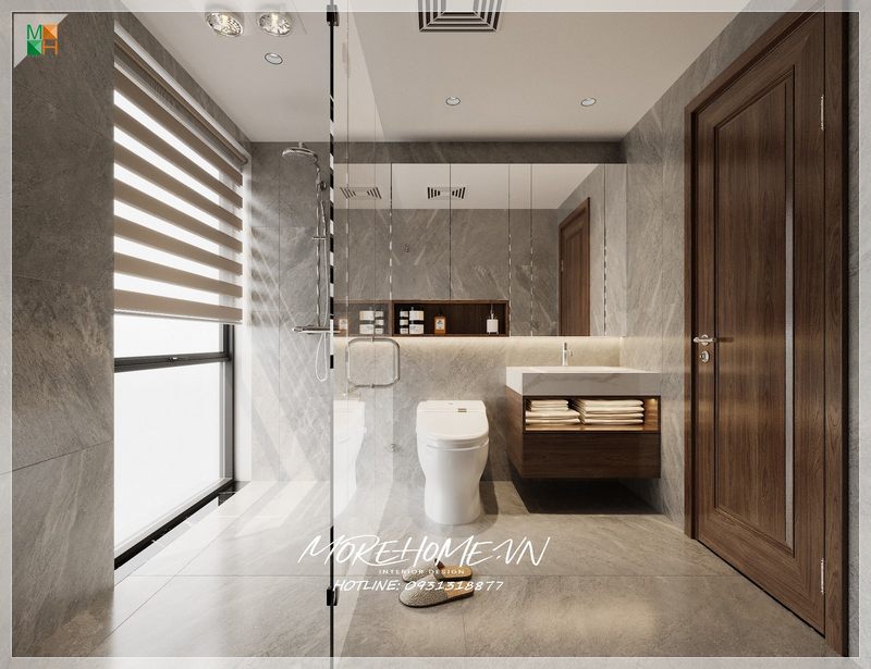 Ngoài cửa gỗ, phòng tắm còn sử dụng thêm cửa kính trong suốt với mục đích tận dụng được nguồn sáng tự nhiên. Đồng thời tạo cảm giác thoáng đãng, khô ráo khi bước chân vào phòng tắm.