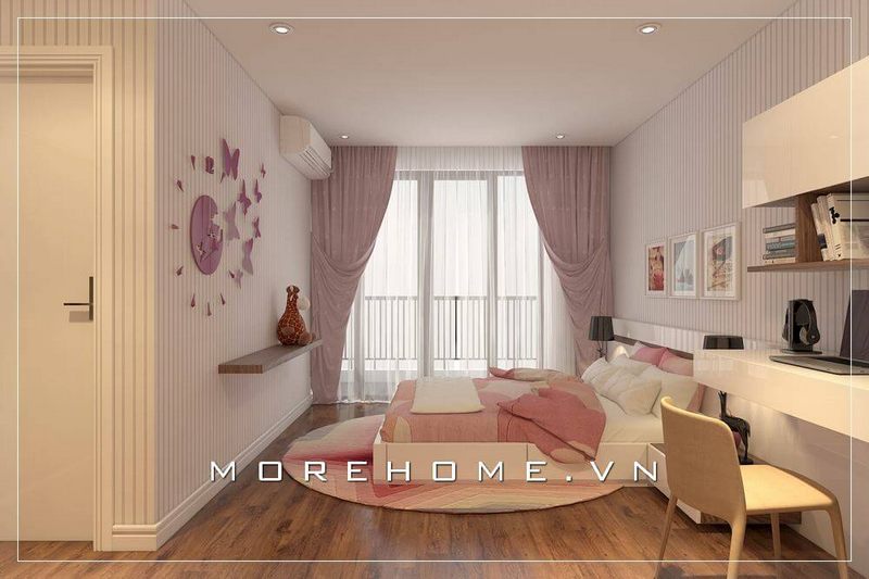Mẫu thiết kế nội thất phòng ngủ cao cấp được bố trí hợp lí và khoa học, tạo ra một không gian nhẹ nhàng, âm thanh dễ thương với tone màu hồng cho phòng ngủ của bé gái.